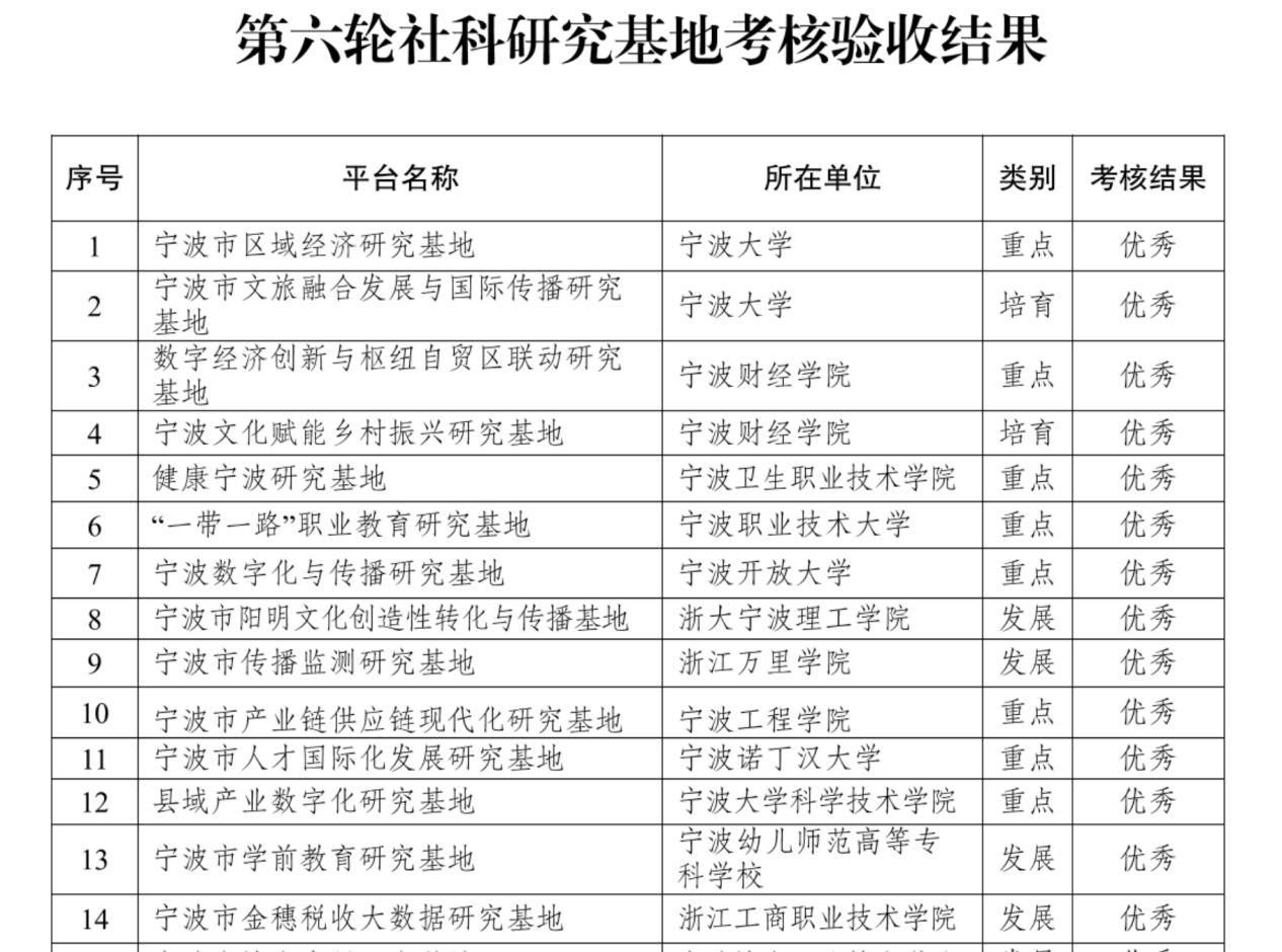 近日,宁波市哲学社会科学工作办公室发布甬哲社科办[2026]4号文件,公布第六轮宁波市哲学社会科学研究基地考核验收结果,由浙江工商职业技术学院与宁波市税务学会联合共建的宁波市金穗税收大数据研究基地凭借扎实的科研建设、丰硕的研究成果和显著的地方服务成效,获评发展类基地“优秀”等次,成为本次全市获评优秀的15家社科研究基地之一,彰显了基地在税收大数据领域的研究实力与服务地方发展的核心价值,是对宁波市金穗税收大数据研究基地建设期内各项工作的高度认可与肯定。